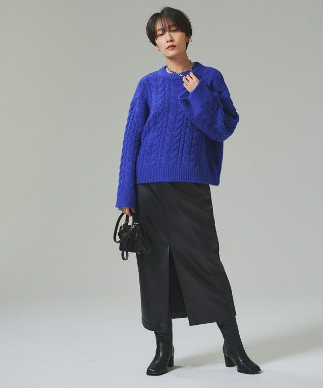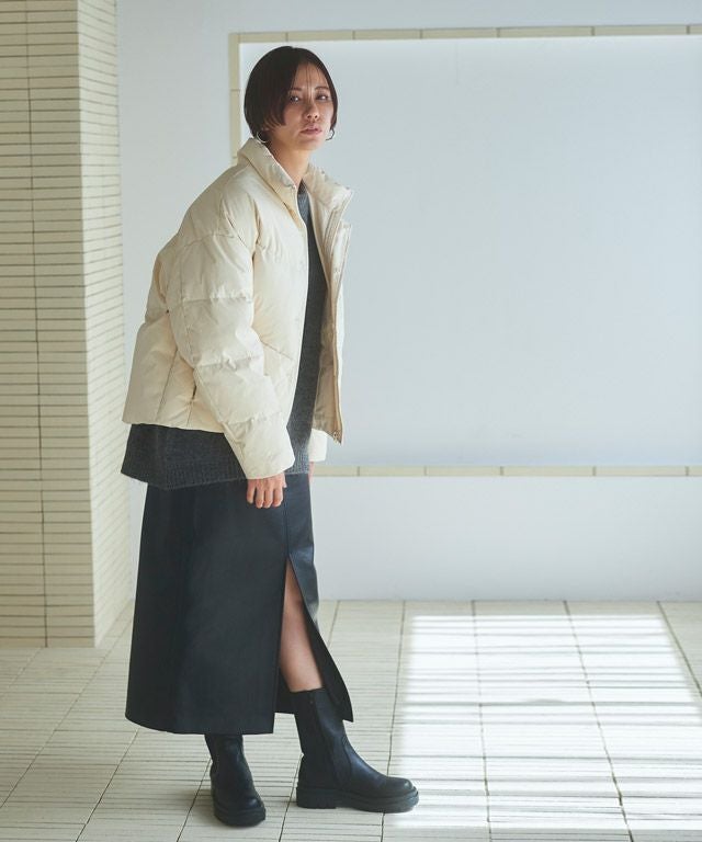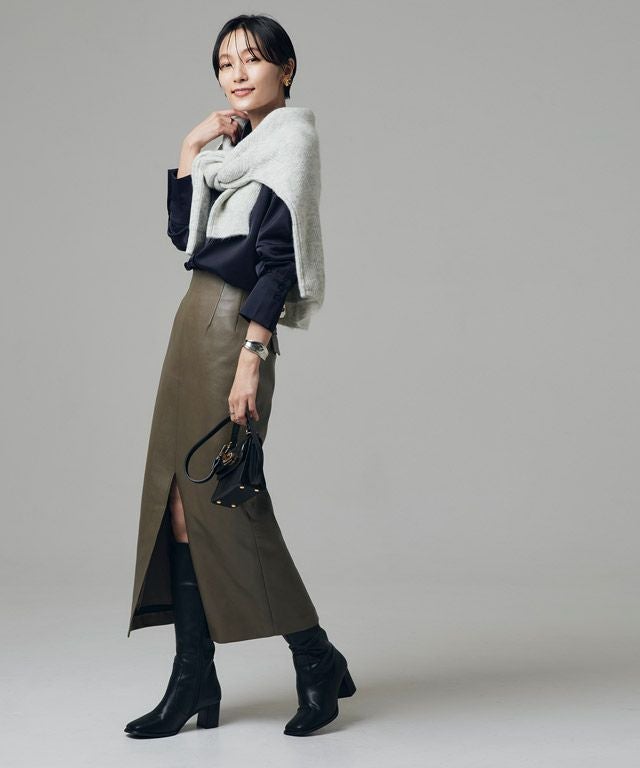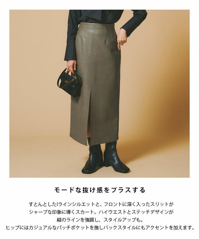 すとんとしたIラインシルエットと、フロントに深く入ったスリットがシャープな印象に導くスカート。ハイウエストとステッチデザインが縦のラインを強調し、スタイルアップも◎ヒップにはカジュアルなパッチポケットを施しバックスタイルにもアクセントを加えます。