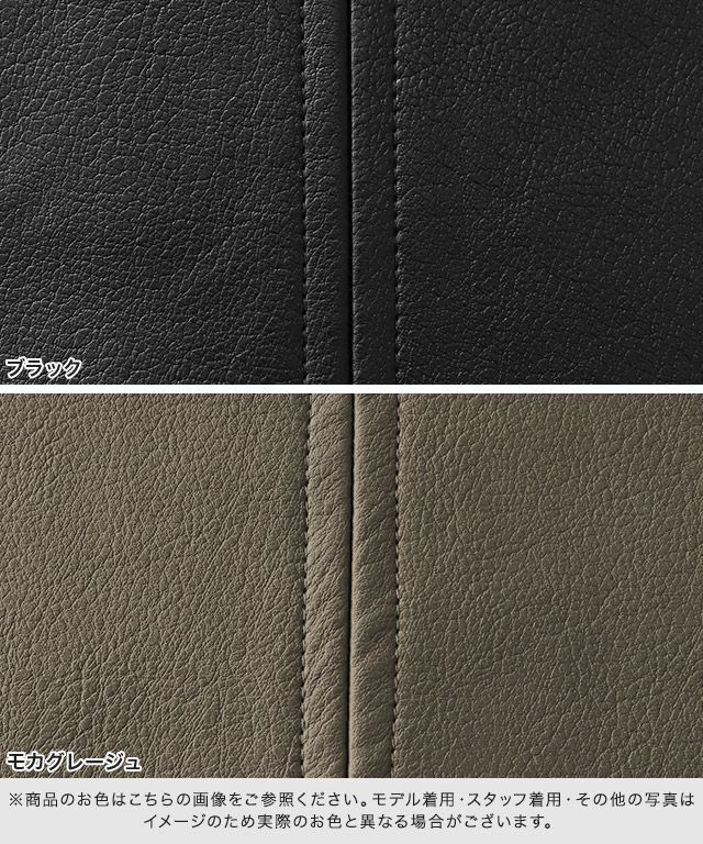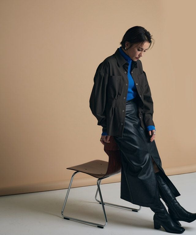 厚みのあるしっかりとしたフェイクレザー素材で綺麗なシルエットを作り出します。表情のある表面が高級感漂う一枚です。