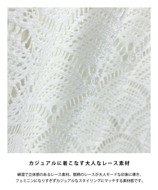 綿混で立体感のあるレース素材。扇柄のレースが大人モードな印象に導き、フェミニンになりすぎずカジュアルなスタイリングにマッチする素材感です。