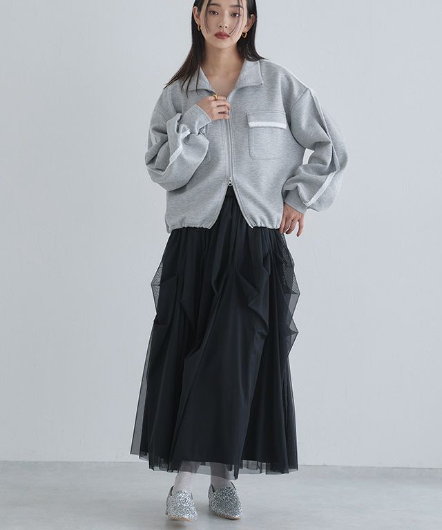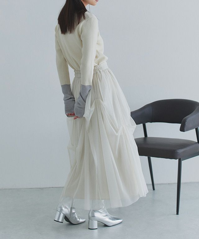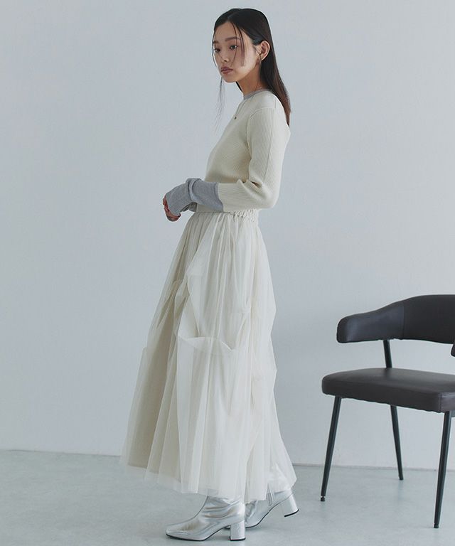 エアリーなチュール素材がレディな印象に導いてくれます。シャカシャカ素材の裏地が透けにくいのもポイントです。