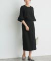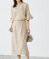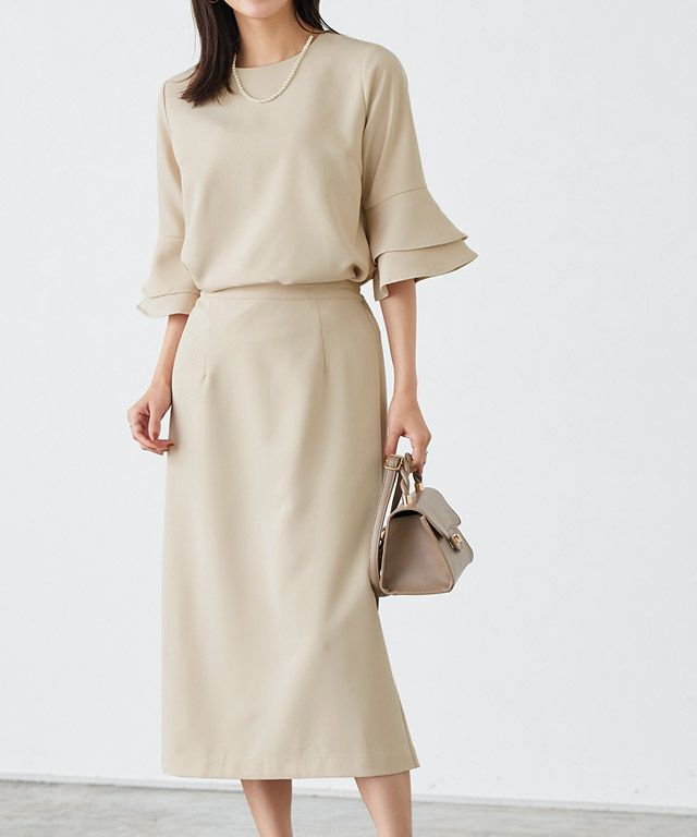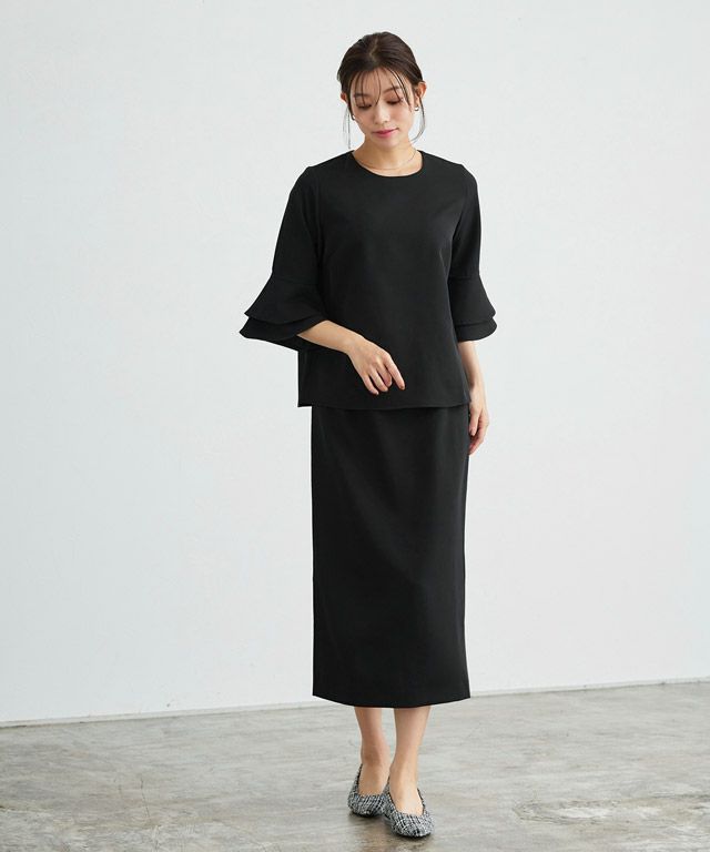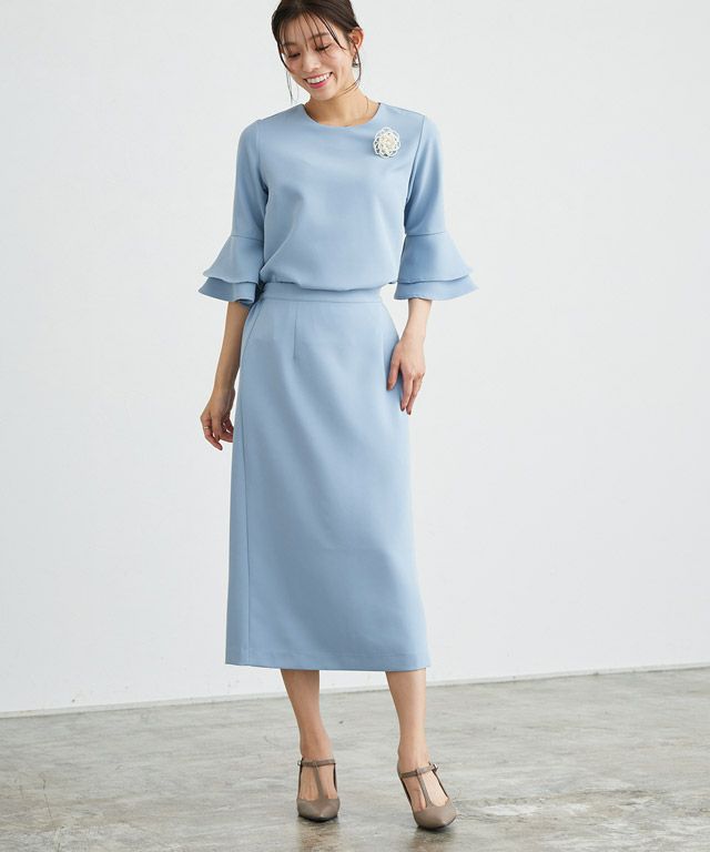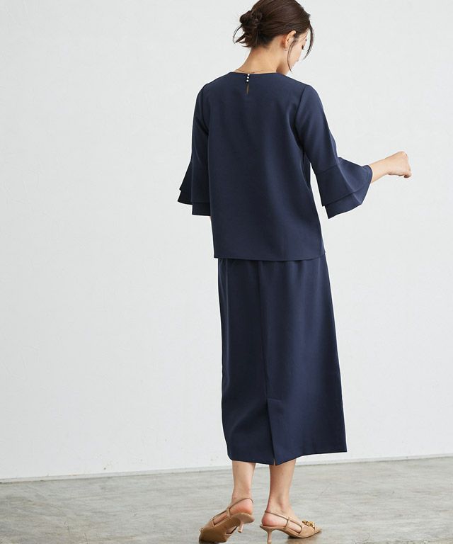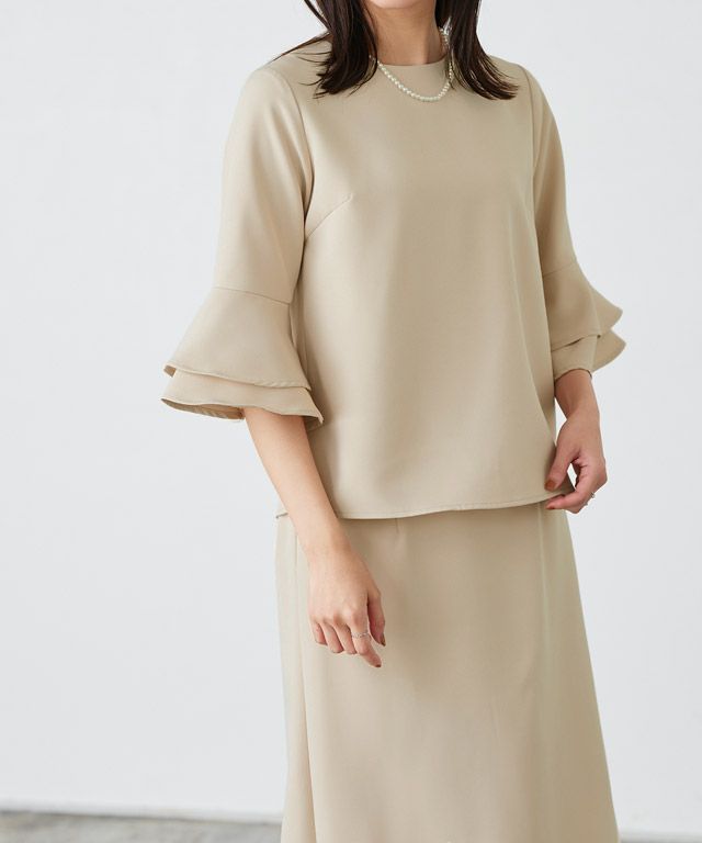 肘部分からフリルを施したデザインがフェミニンな印象に。手首に抜け感をプラスしてくれる七分袖で、やや広めのクルーネックデザインが女性らしい雰囲気に。スカートはIラインですっきりシンプルなデザインに仕上げました。セットアップでちょっとしたお出かけやオケージョンシーンにはもちろん、単品で普段使いとしても着回せます。