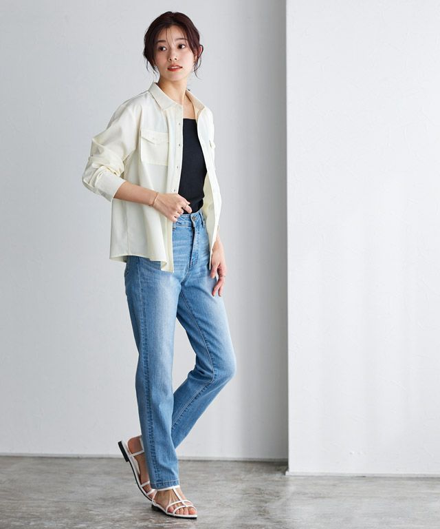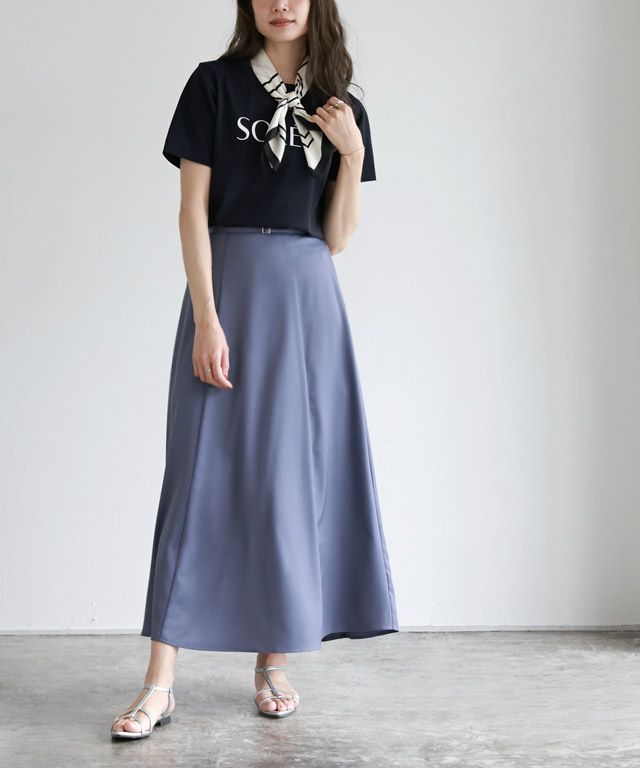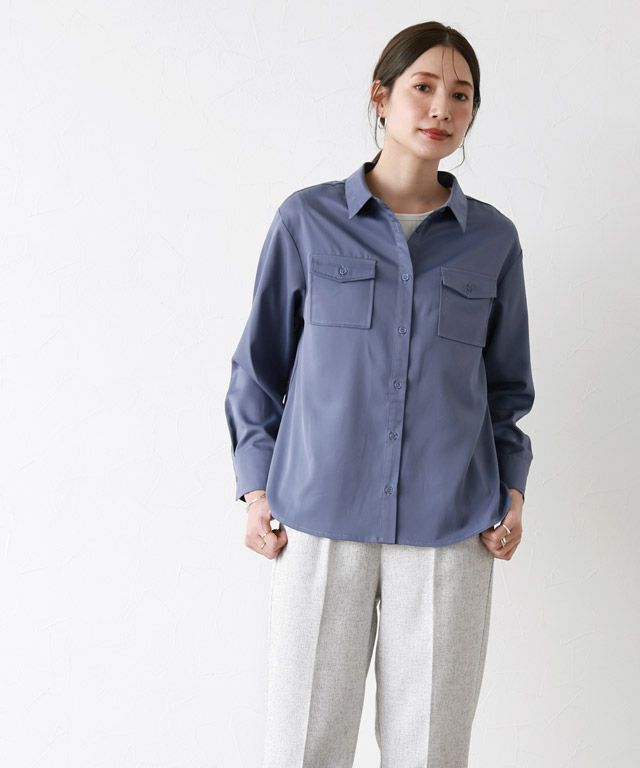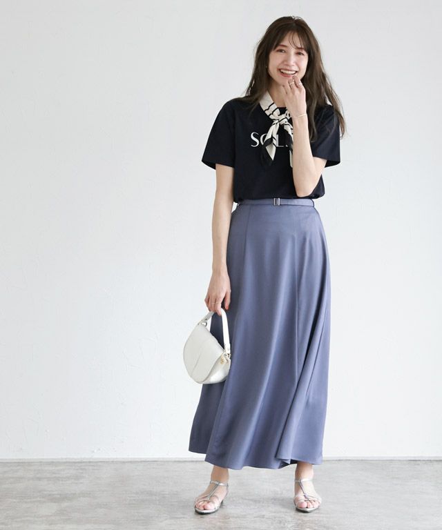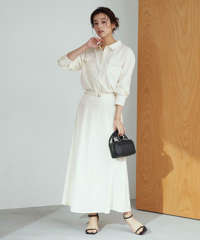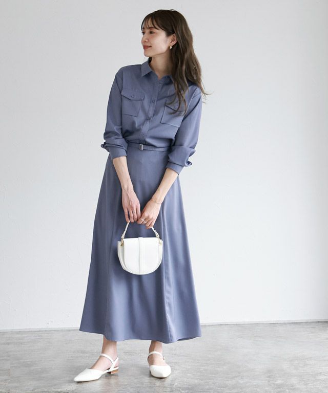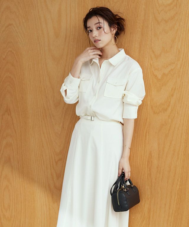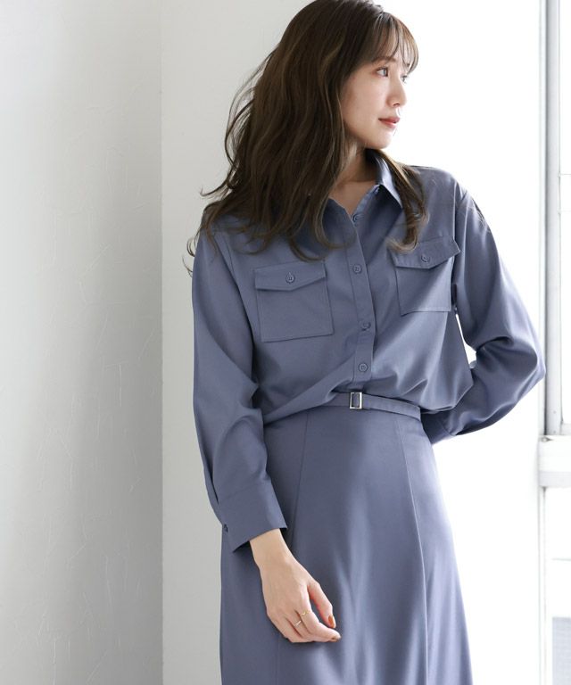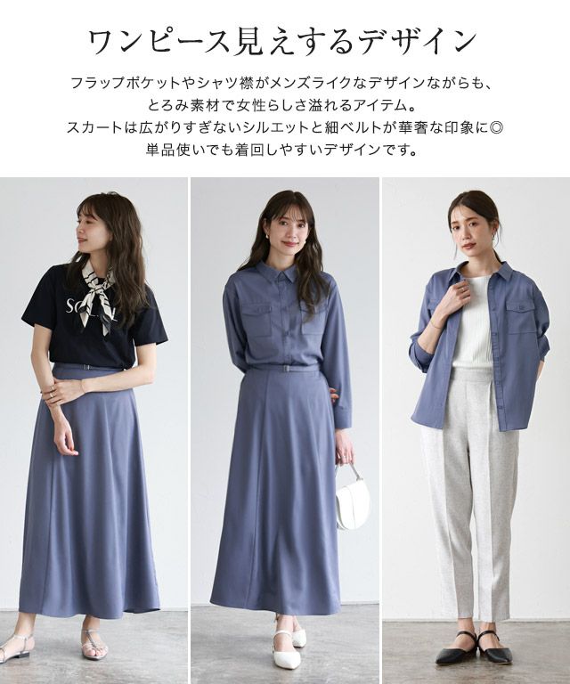 フラップポケットやシャツ襟がメンズライクなデザインながらも、とろみ素材で女性らしさ溢れるアイテム。スカートは広がりすぎないシルエットと細ベルトが華奢な印象に◎単品使いでも着回しやすいデザインです。