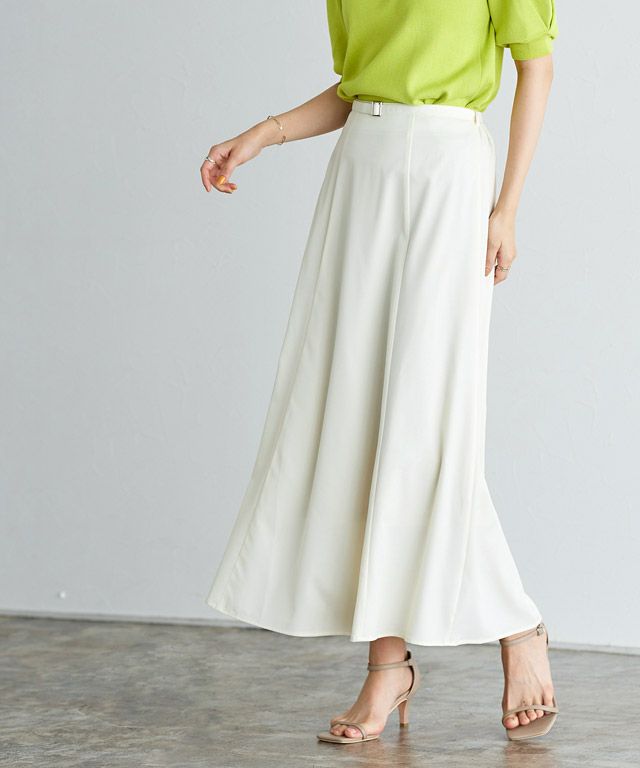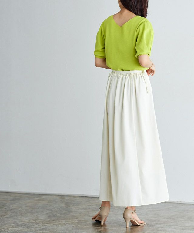 着丈は足首が見える丈感でした。ウエストは後ろがゴムでゆとりがあり、ヒップにはゆとりがあります。滑らかで上品な素材です。スカートの揺れ感が綺麗です。