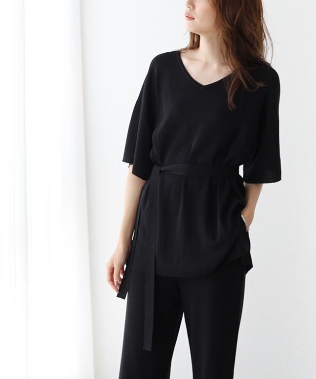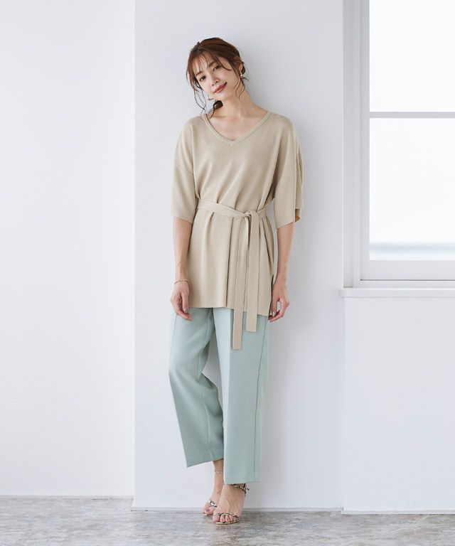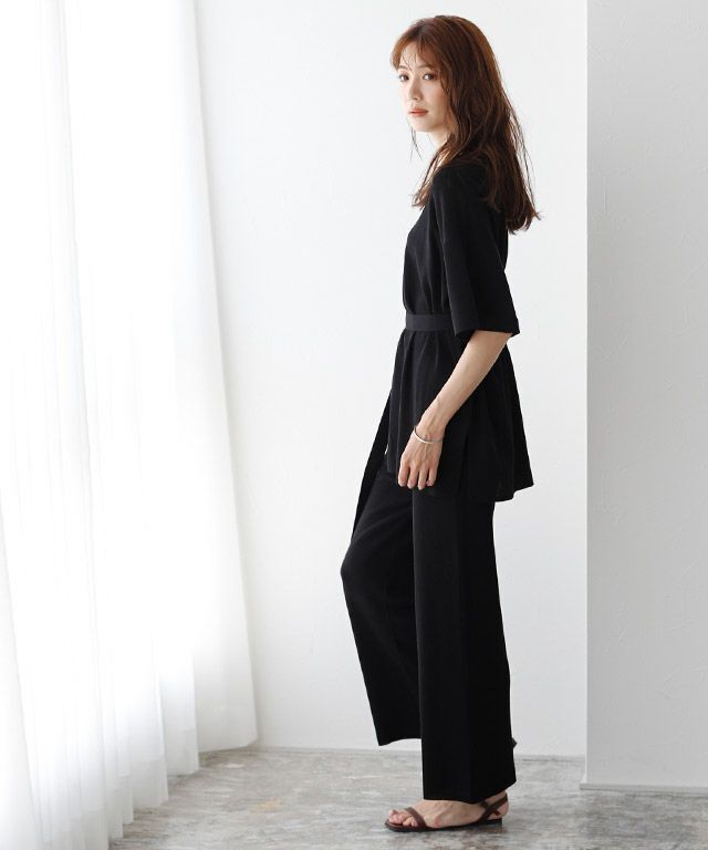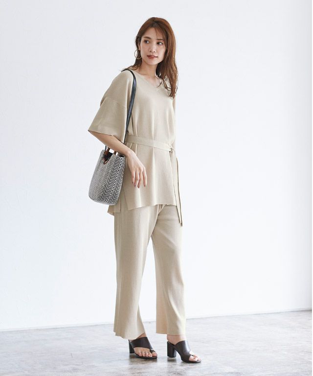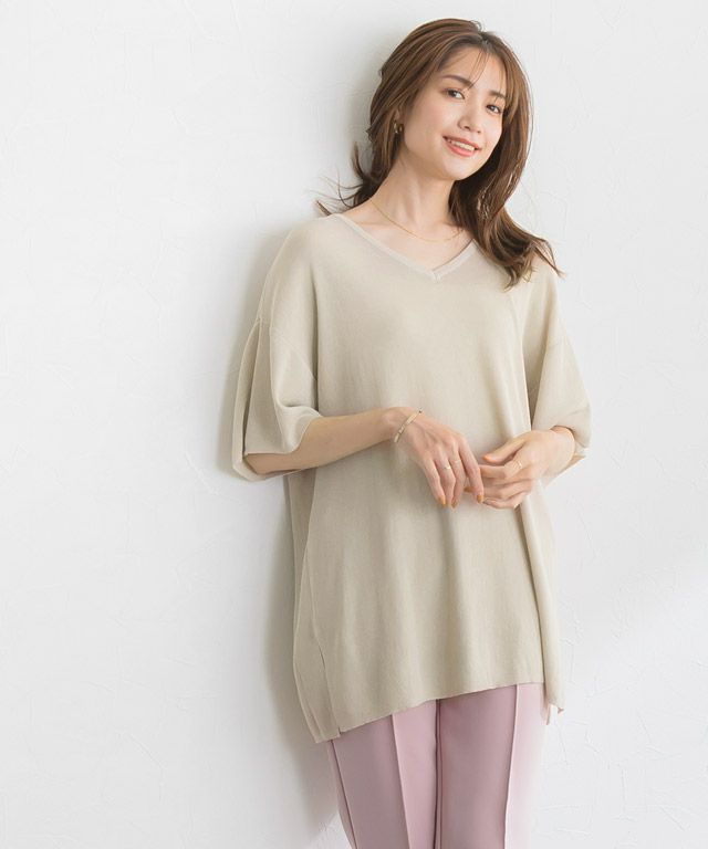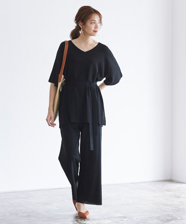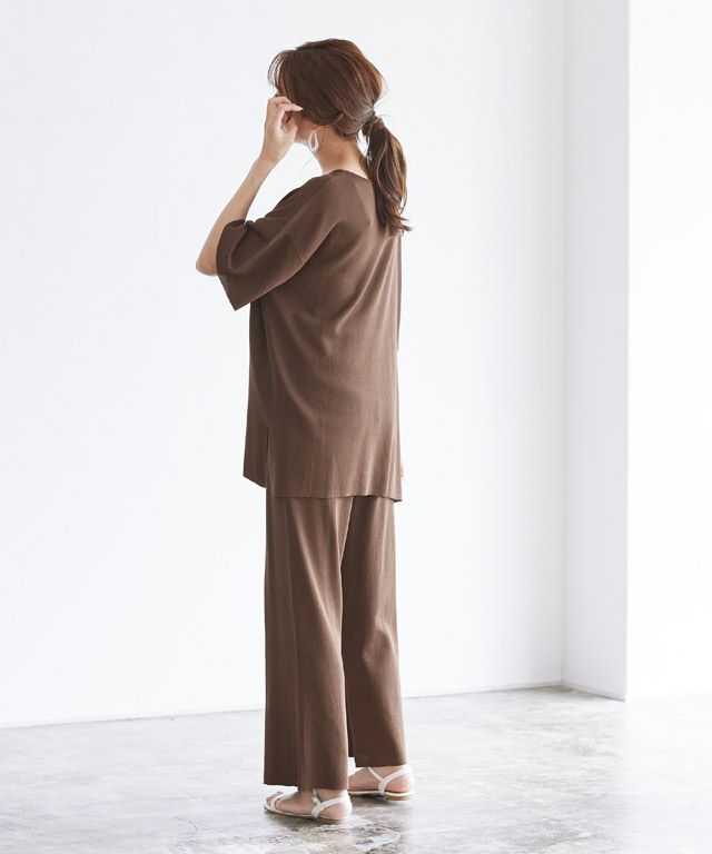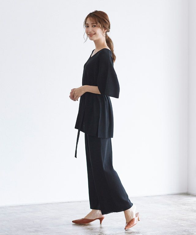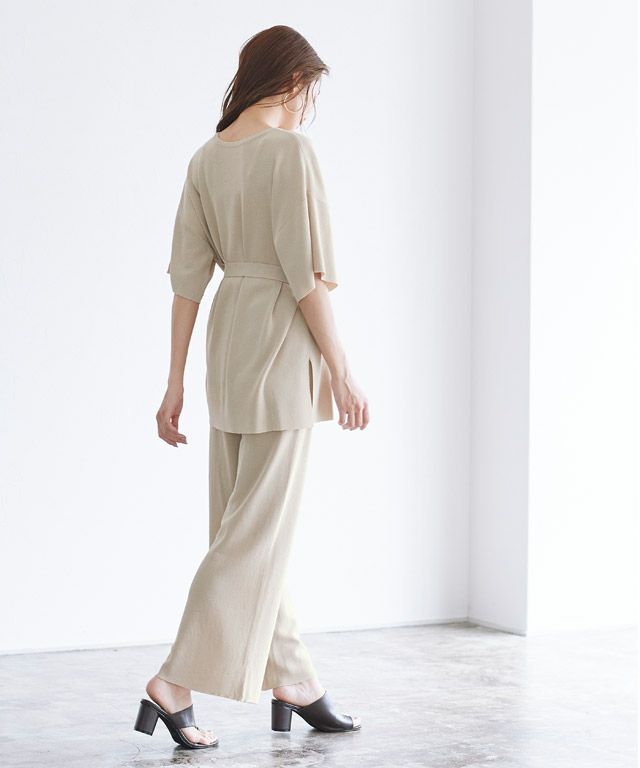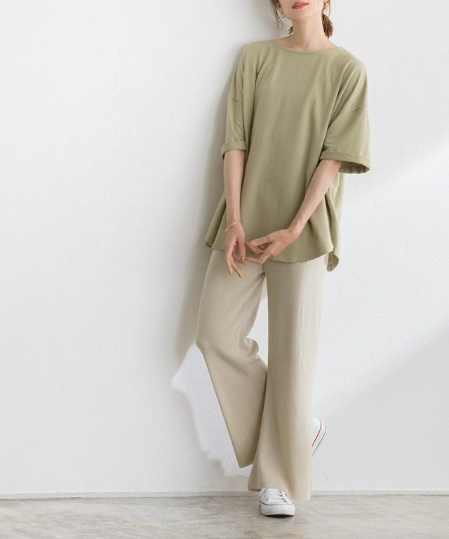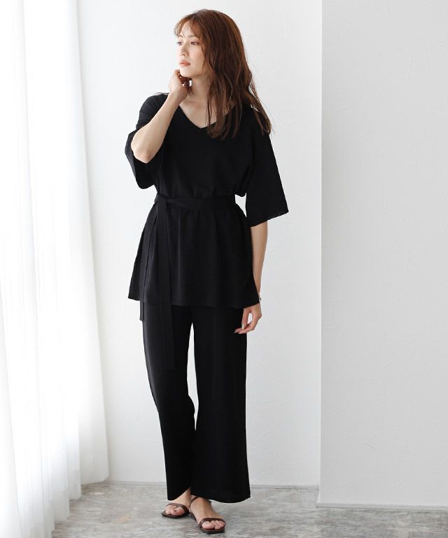 上:着丈はお尻がすっぽりと隠れる丈感でした。袖丈は肘下の丈感で、Vネックも開きすぎない程よいラインでした。 下:着丈は足首下です。丈が長く、床についてしまいます。ウエストが折れるので折れば問題なく着用できます。ウエストはゴムなので楽ちんです。シャリ感のある涼し気な素材です。 |