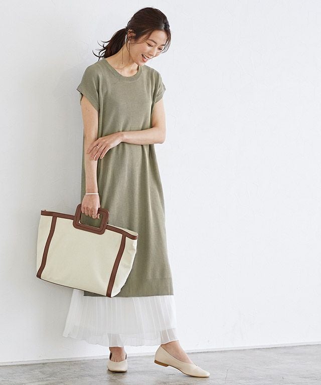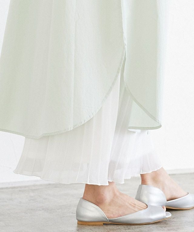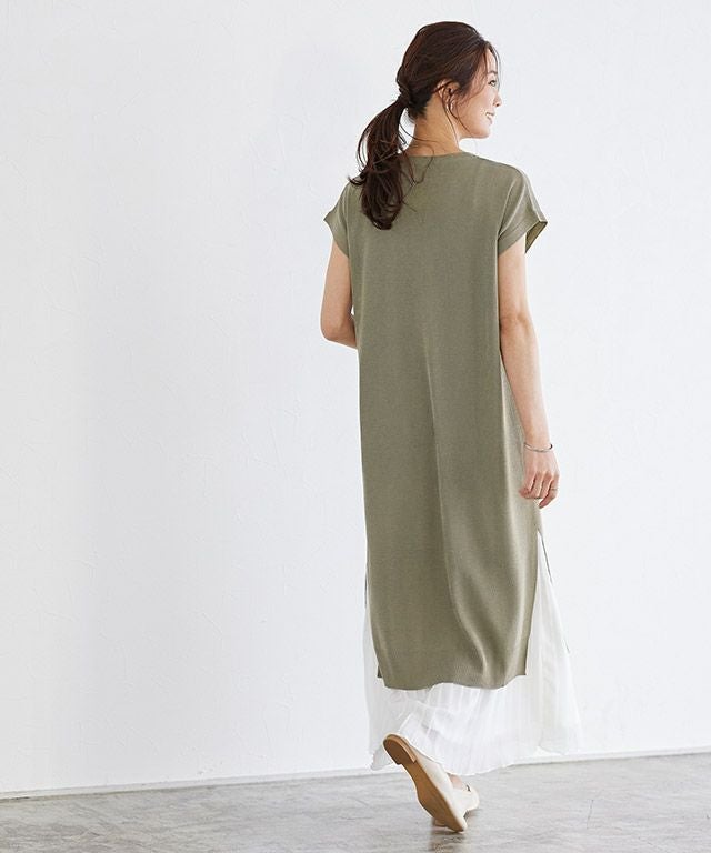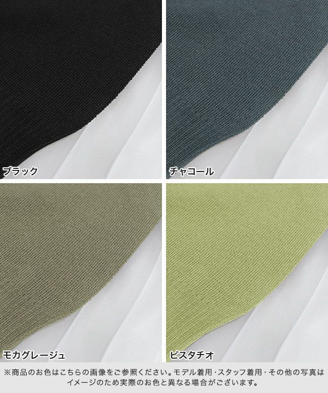 サラッとした風合いで清涼感があり、夏でも着心地の良いニット素材。少し光沢感もあり上品な印象に仕上げてくれます。インナーのプリーツ部分は軽やかなシフォン素材で女性らしさをプラス。