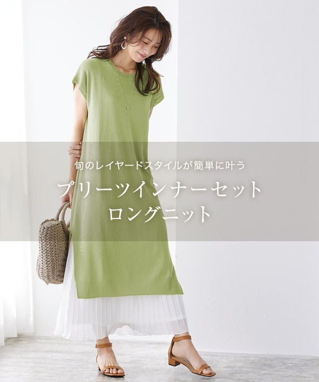 旬のレイヤードスタイルが簡単に叶う“プリーツインナーセットロングニット”