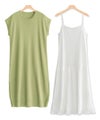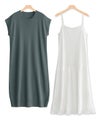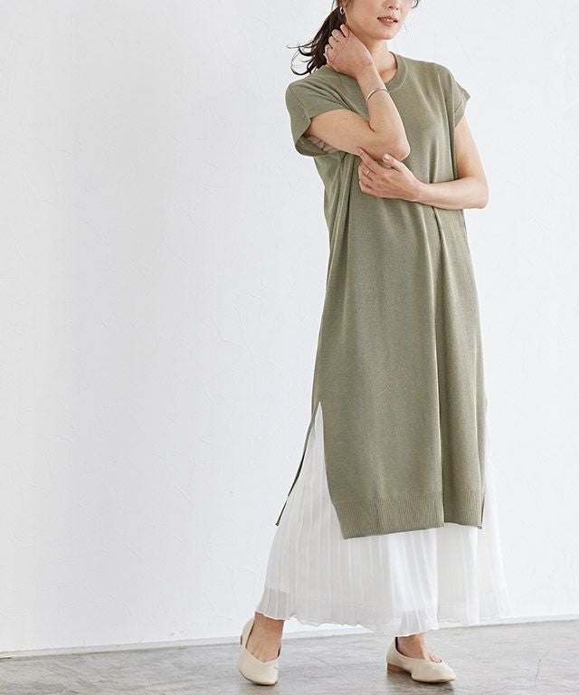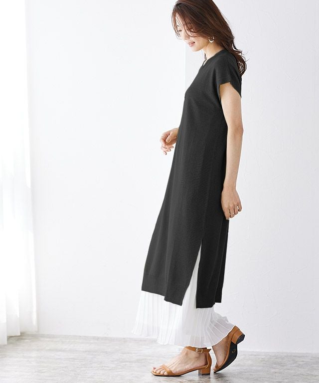 スリットの入ったロングニットにプリーツインナーを合わせたセットで簡単にサマ見えする一枚。インナーはアジャスター付きで調節可能です。ニット単体でボトムと合わせたり、チュニックやロングトップスとしても着回しできるアイテムです。