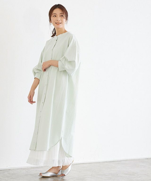 着丈はふくらはぎが半分隠れる程度の丈感です。袖丈は二の腕が少し隠れます。