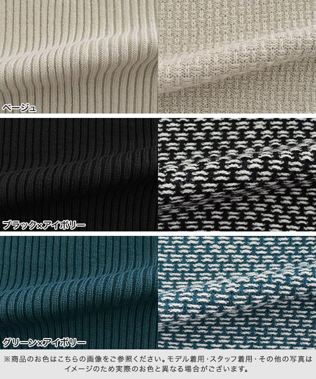 また、ニット製品は生産の過程上「生地を織る際の糸の継ぎ目」繊維の「混紡」、プレス加工、製品洗い加工によって形やサイズ(5cm前後)に誤差が生じる場合がございますが品質上の問題はございません。