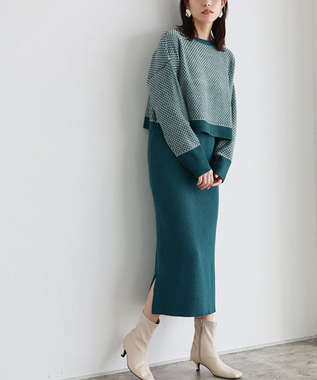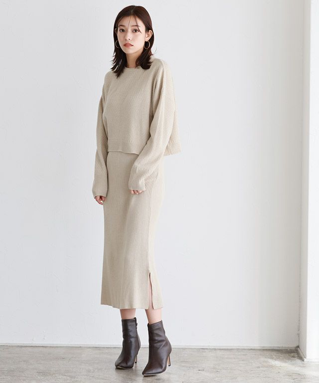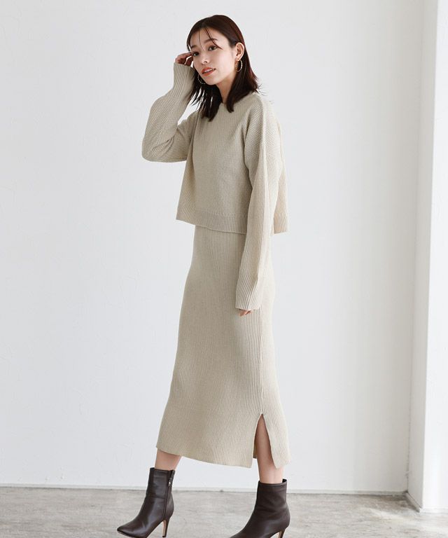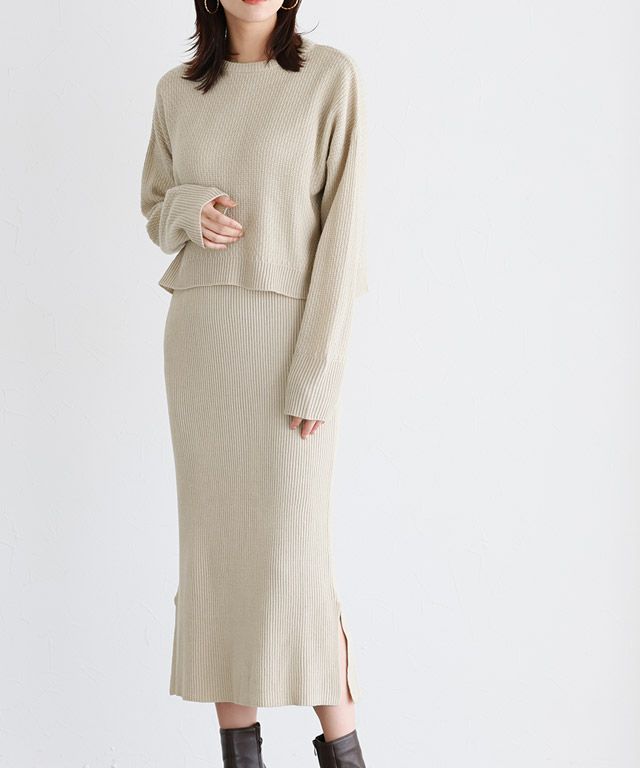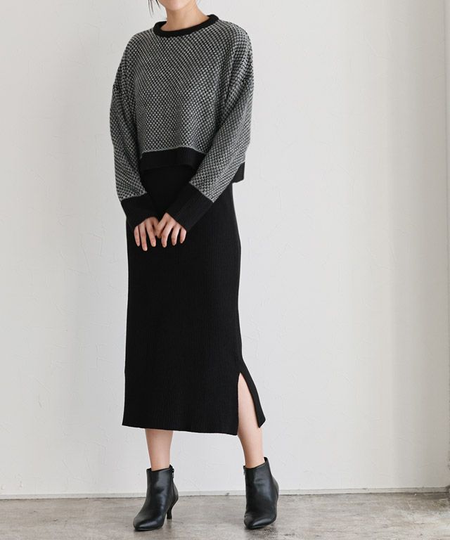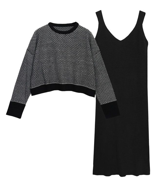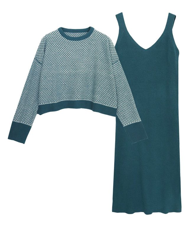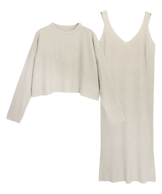 ニットキャミワンピースとショート丈のニットトップスの2点セット。着るだけでおしゃれなスタイリングが完成する絶妙な丈バランスにこだわりました。それぞれ単品でも着回しができるので、着こなしの幅がかなり広がるアイテムです。
