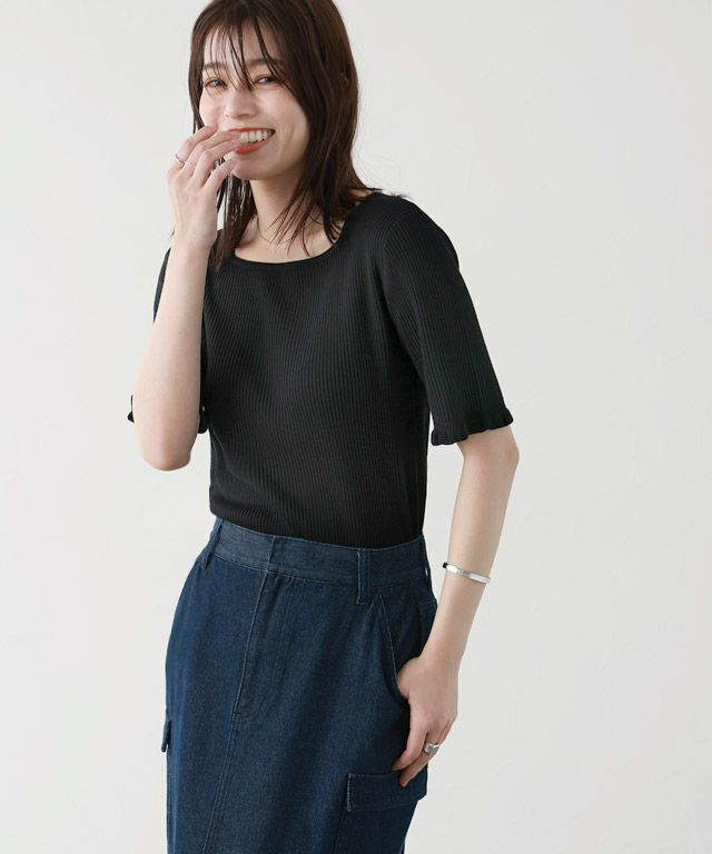 さらっとした風合いで清涼感があり、夏でも着心地の良いニット素材。少し光沢感があるのでカジュアルになりすぎず上品な印象に仕上がります。