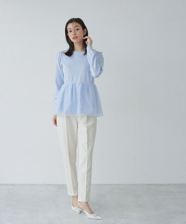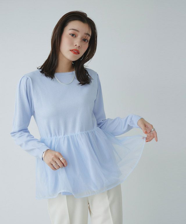 柔らかい肌触りが魅力的なレーヨン混のニット素材で裾にオーガンジーをドッキングさせた一枚で着映え感のあるニット。