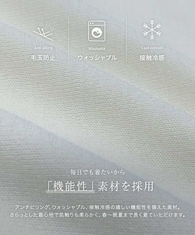 アンチピリング、ウォッシャブルのうれしい機能を兼ね備えた素材を使用。さらっとした着心地で、肌ざわりもやわらかく、長くご愛用いただけます。程良い伸縮性があるため、身頃だけでなく腕周りの窮屈さも軽減され、ストレスフリーな着心地を実現します。