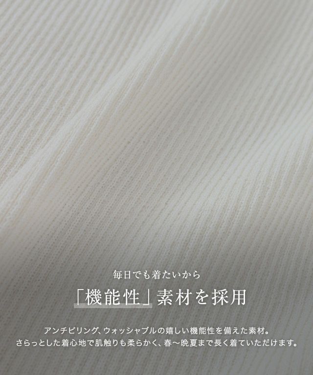 アンチピリング、ウォッシャブルの嬉しい機能を兼ね備えた素材を使用。さらっとした着心地で肌触りも柔らかく、春~晩夏まで長く着ていただけます。程良い伸縮性があるので身頃だけでなく腕周りの窮屈感も軽減され、ストレスフリーな着心地を叶えます。