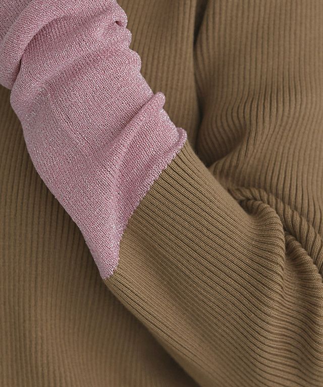レーヨン混のやわらかな風合いが上品なニット素材。細めのリブ編みが表情をプラスします。袖とネックの配色部分は程よい透け感のラメ素材でアクセントをプラス。