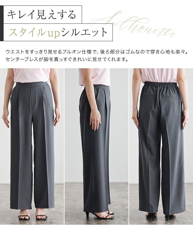 ウエストをすっきり見せるプルオン仕様で、後ろ部分はゴムなので穿き心地も楽々。センタープレスが脚を真っすぐきれいに魅せてくれます。トレンドに左右されずベーシックに着られるデザインに仕上げました。