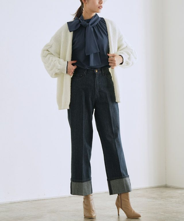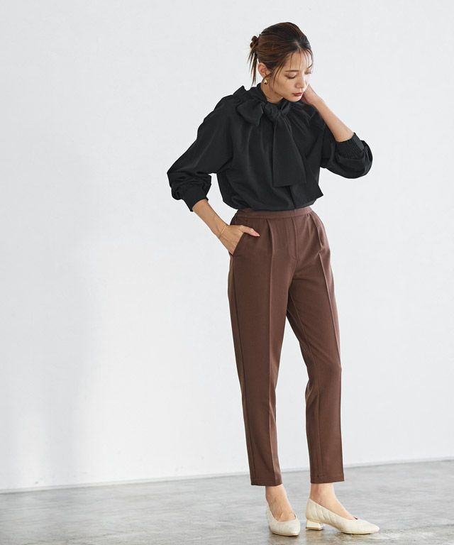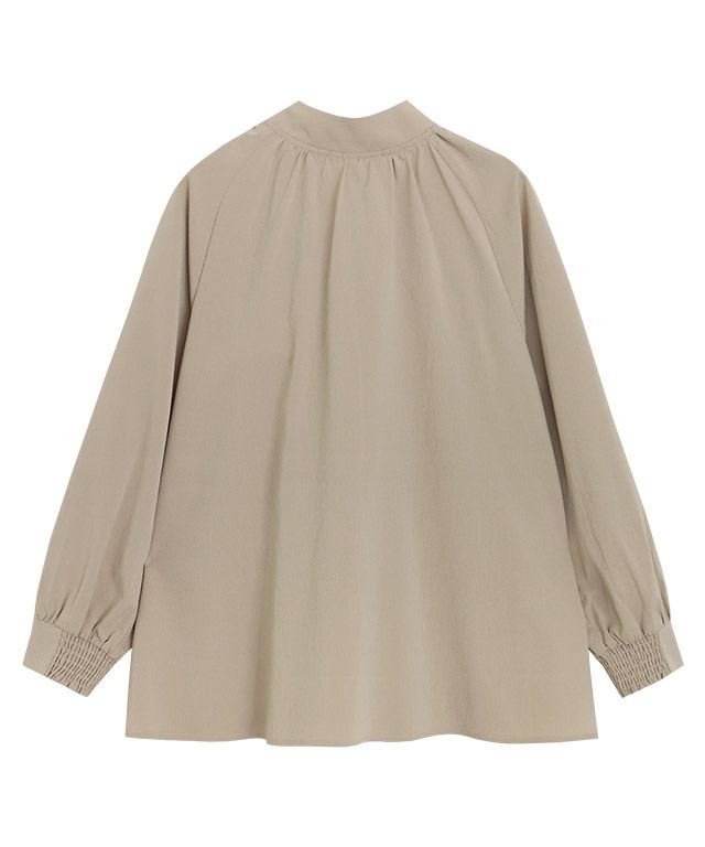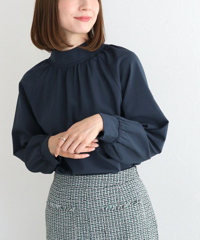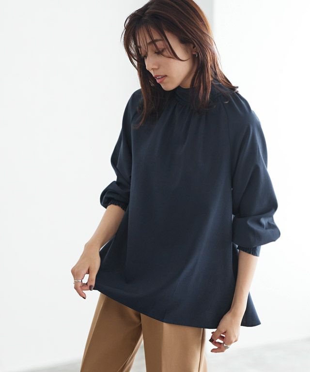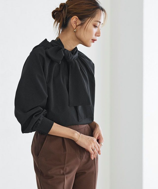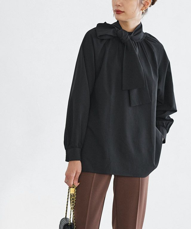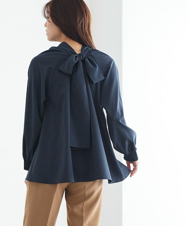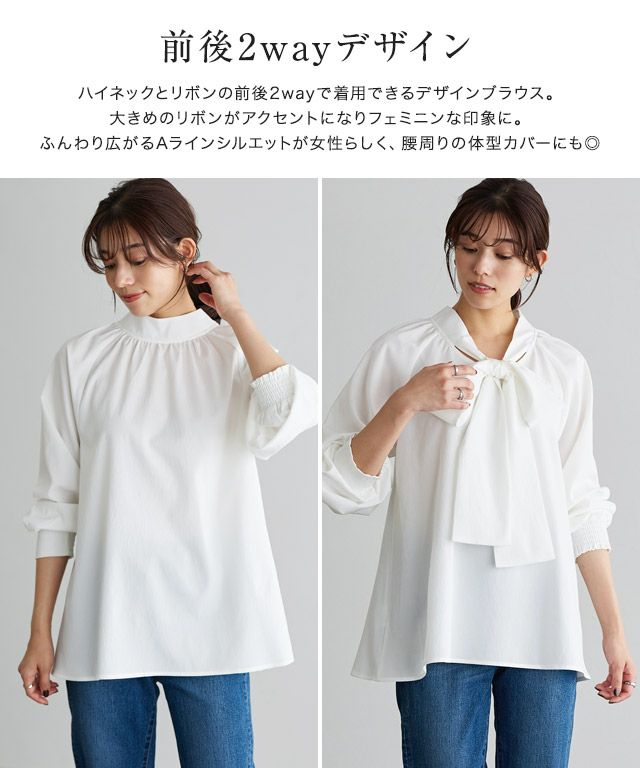 ハイネックとリボンの前後2wayで着用できるデザインブラウス。大きめのリボンがアクセントになりフェミニンな印象に。様々な結び方ができ、いろんなスタイリングに着回せます。ふんわり広がるAラインシルエットが女性らしく、腰周りの体型カバーにも◎インスタイルもしやすいフレア感に仕上げました。一枚での着用はもちろん、ジレやベスト、ジャケットなどのインナーとしての着用もおすすめです。