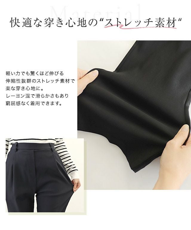 伸縮性抜群のストレッチ素材で楽な穿き心地に。レーヨン混で滑らかさもあり窮屈感なく着用できます◎