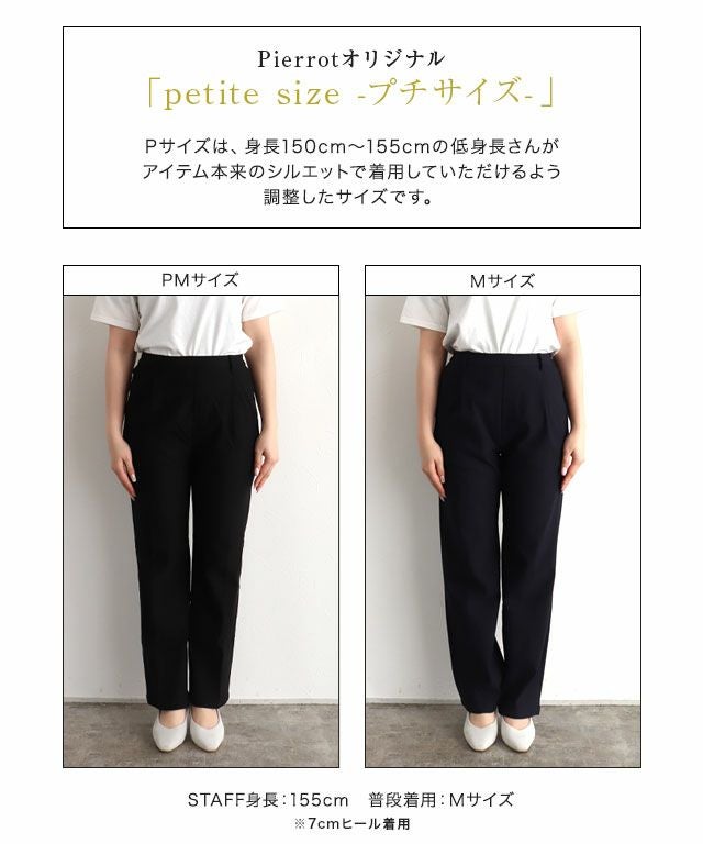 M…着丈は足首下で裾が床に付いてしまう丈感でした。ウエストはゆとりがあり、ヒップにはややゆとりがあります。脚周りは程よいゆとりがありました。Mサイズは長すぎたのでPMサイズを選びます。