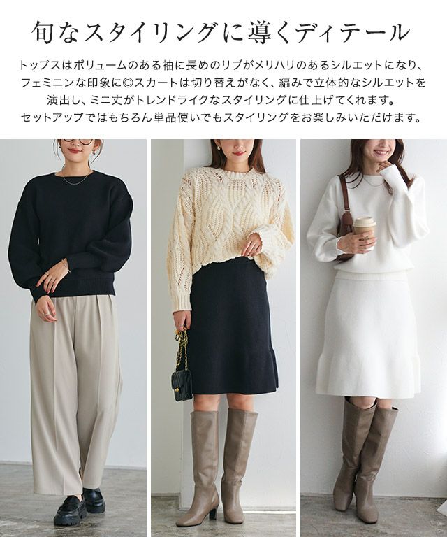 トップスはボリュームのある袖に長めのリブがメリハリのあるシルエットになり、フェミニンな印象に◎スカートは切り替えがなく、編みで立体的なシルエットを演出し、ミニ丈がトレンドライクなスタイリングに仕上げてくれます〇セットアップではもちろん単品使いでもスタイリングをお楽しみいただけます。