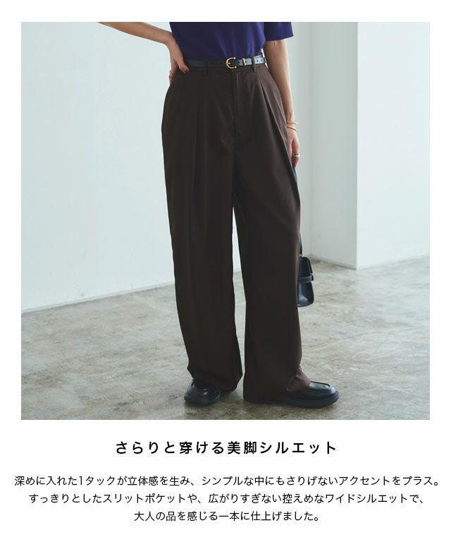 深めに入れた1タックが立体感を生み、シンプルな中にもさりげないアクセントをプラス。すっきりとしたスリットポケットや、広がりすぎない控えめなワイドシルエットで、大人の品を感じる一本に仕上げました。