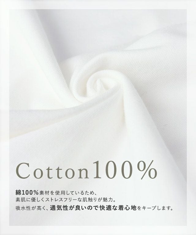 綿100%素材を使用しているため、素肌に優しくストレスフリーな肌触りが魅力。吸水性が高く、通気性が良いので快適な着心地をキープします。
