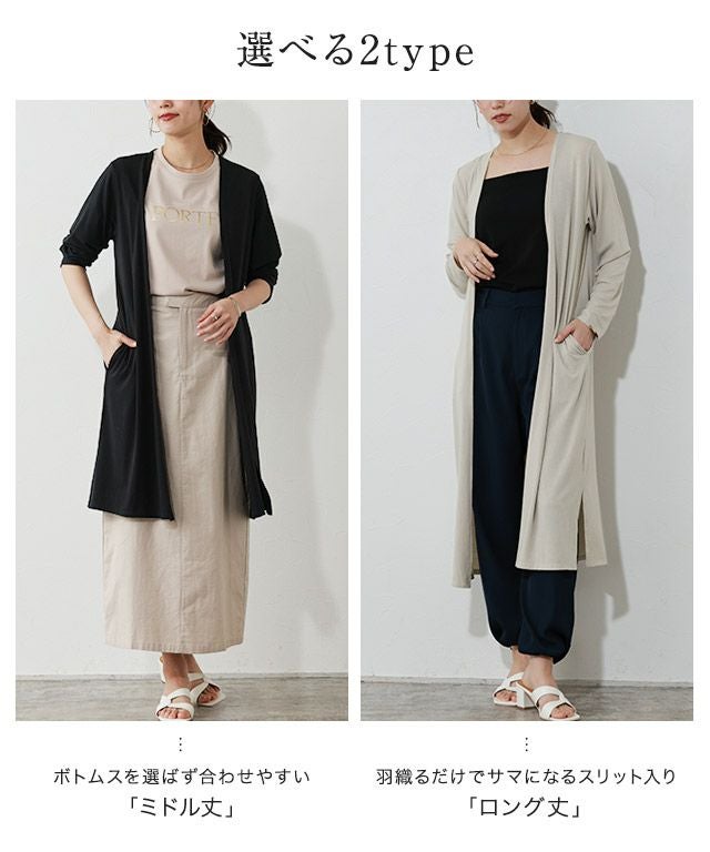 着丈はひざ下辺りの丈感でした。袖丈は手首辺りです。全体的にゆとりがあります。なめらかで柔らかい生地感で肌触りが良いです。さらっと羽織れるので春先に大活躍するアイテムです。