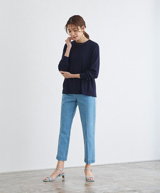 バックプリーツデザインとシンプルな身頃で、華奢見えするメリハリあるシルエットに。ネックラインは上品なクルーネック。袖はシンプルなので重くなりすぎず、きちんと感もプラスします。