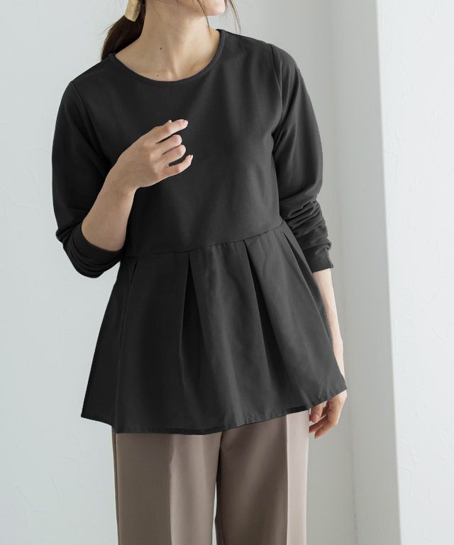 上身頃にはシーズンムードのある薄手のミニ裏毛を採用し、綿混素材でさらっとした着心地。切り替え部分も綿混のシャツ素材でややハリ感があるので、上品に広がるフレアシルエットを演出します。