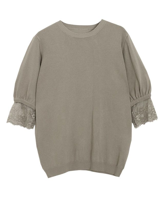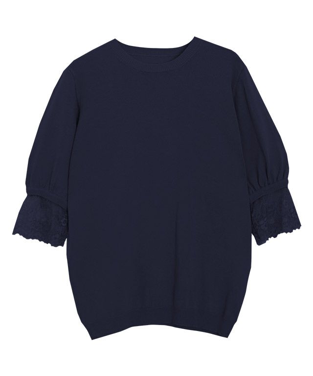 一番の魅力は、袖にあしらったレース。シンプルなボトムスに合わせるだけで、フェミニンなスタイリングが完成します。袖のレースが、さらにきちんと感のある印象。