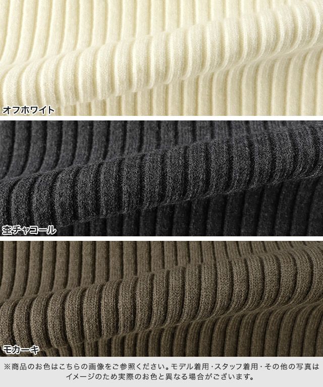また、ニット製品は生産の過程上「生地を織る際の糸の継ぎ目」繊維の「混紡」、プレス加工、製品洗い加工によって形やサイズ(5cm前後)に誤差が生じる場合がございますが品質上の問題はございません。