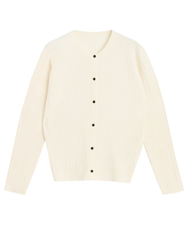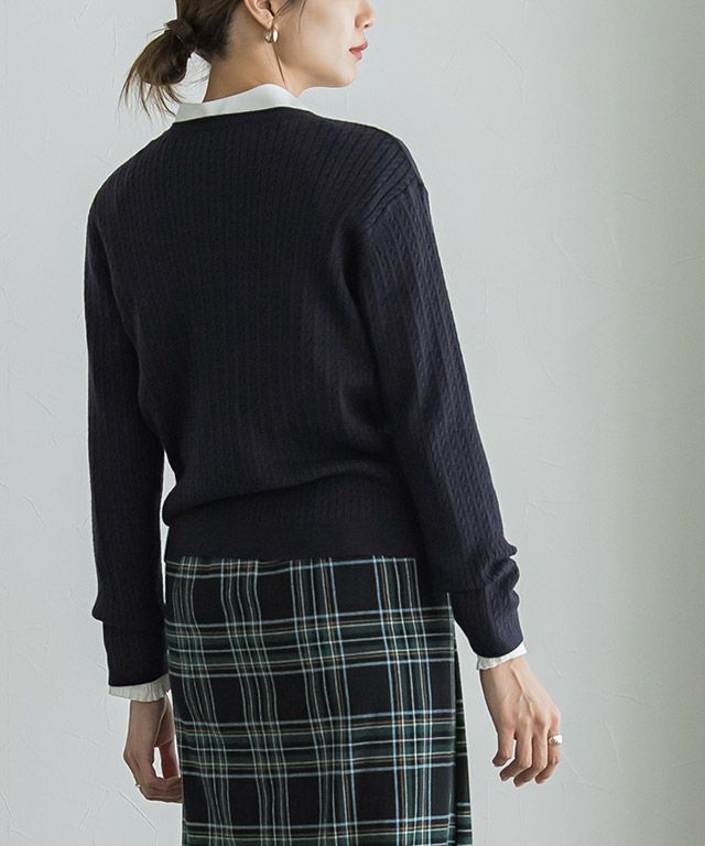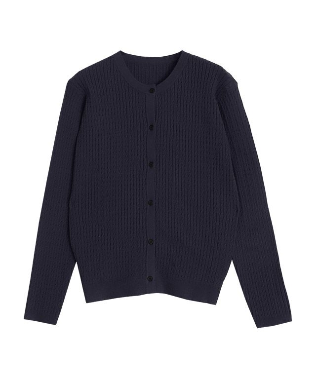 立体的なケーブルデザインを全面に施したニットカーディガン。主張しすぎない細いラインで上品な印象へと導きます。ブラックの釦でアクセントをプラスしました。