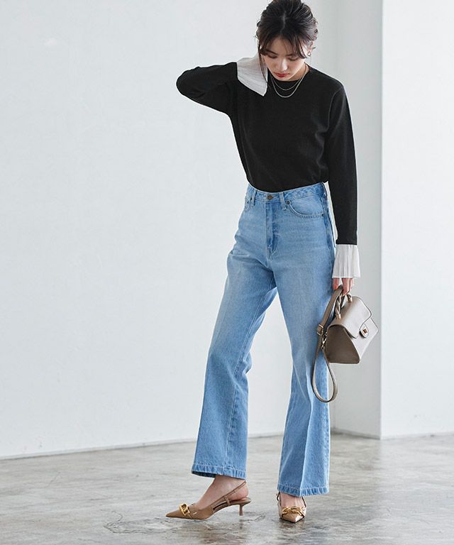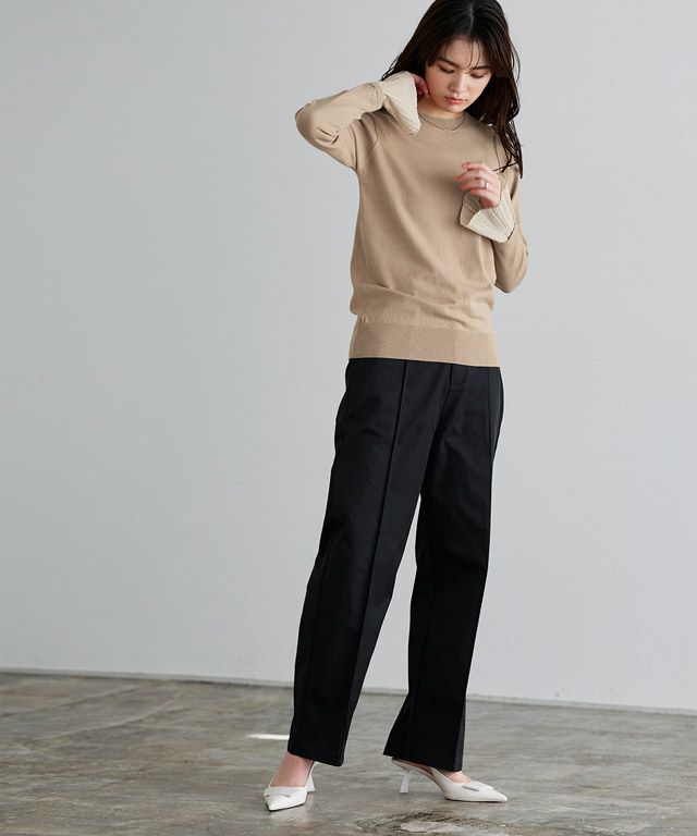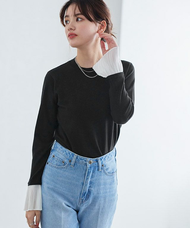 袖口に程良く透け感のある布帛生地をドッキングしたデザインニット。着るだけで着映え感のあるスタイリングが叶います。一枚での着用はもちろん、ジレやジャンパースカートのインナーとしても活躍◎ボトムスを選ばず着回しやすいデザインです。