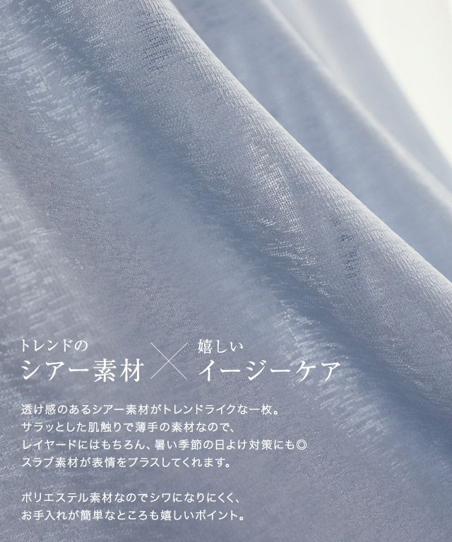 透け感のあるシアー素材がトレンドライクな一枚。サラッとした肌触りで薄手の素材なので、レイヤードにはもちろん、暑い季節の日よけ対策にも◎スラブ素材が表情をプラスしてくれます。ポリエステル素材なのでシワになりにくく、お手入れが簡単なところも嬉しいポイント。