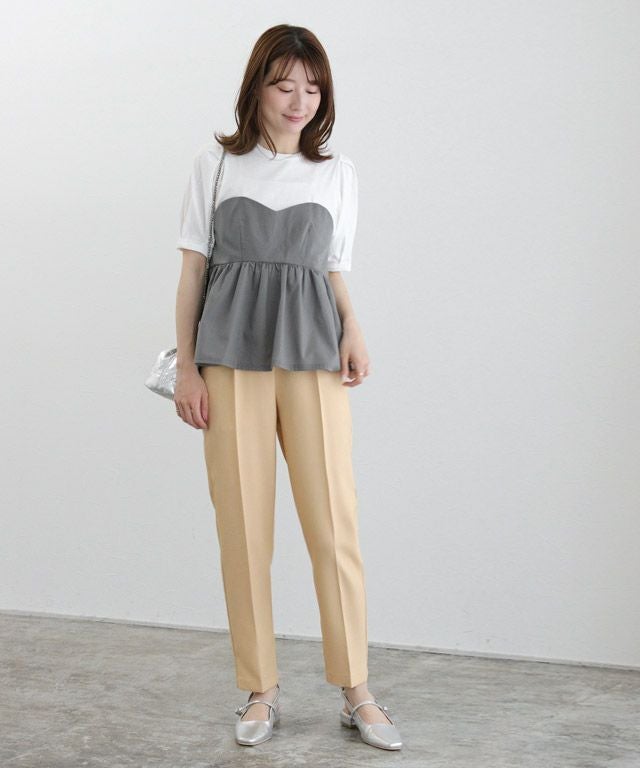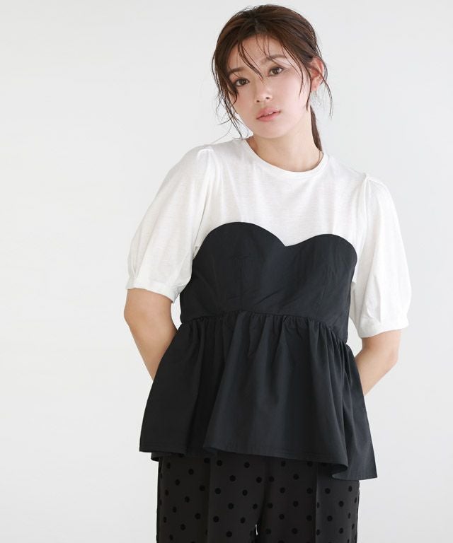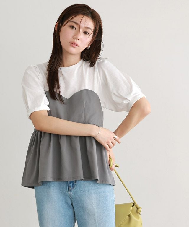 ビスチェがドッキングされたデザインで一枚着るだけでトレンド感のある着こなしが叶う優秀トップス。程良くボリューム感のあるパフスリーブとウエスト部分で切り替えたペプラムデザインが、女性らしい印象に導きます。腰回りの体型カバーが叶うところも嬉しいポイント。