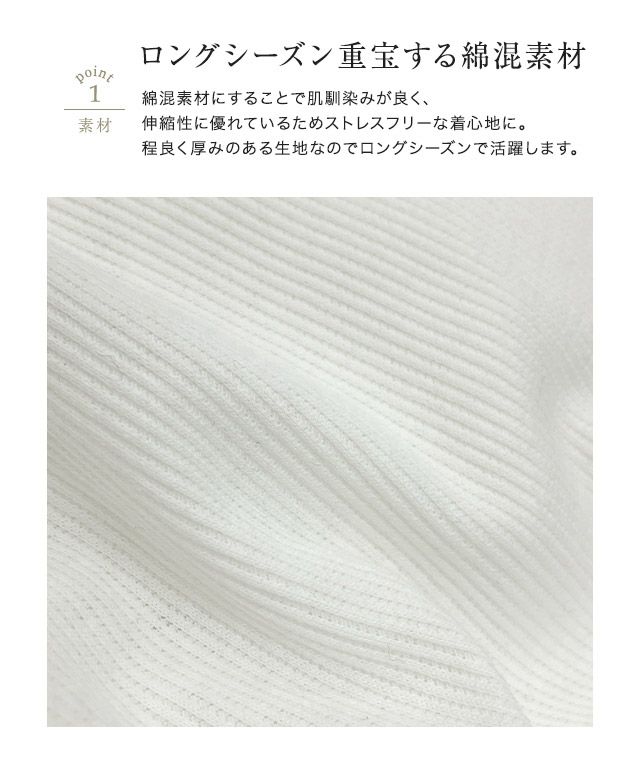 綿混素材にすることで肌馴染みが良く、伸縮性に優れているためストレスフリーな着心地に。程良く厚みのある生地なのでロングシーズンで活躍します。テレコリブが表情をプラスし、インナーで見えた時もアクセントをプラス。