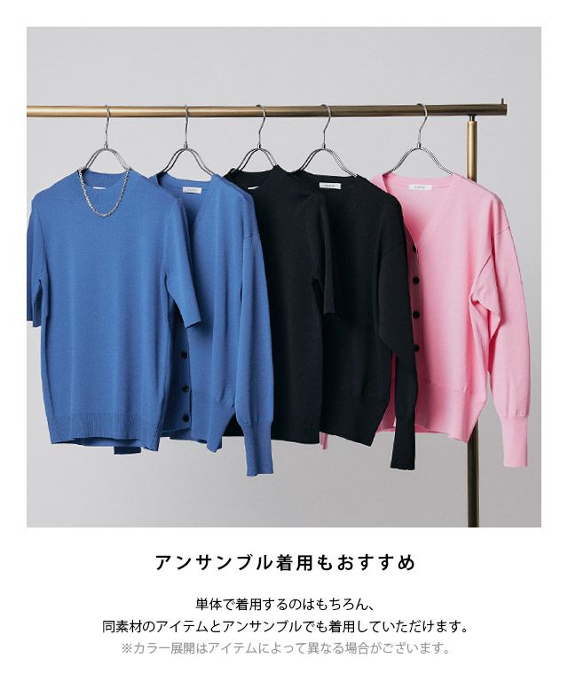 「接触冷感・毛玉防止・ウォッシャブル」の3つの機能を持ち合わせた素材でデイリー使いしやすい定番アイテム。滑らかな表面感と程よくハリのある素材は大人っぽく上品な印象を与えます。レーヨン混で肌触りも良く快適な着心地です。
