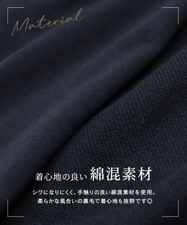 シワになりにくく、手触りの良い綿混素材を使用。柔らかな風合いの裏毛で着心地も抜群です◎UV機能付きなところも嬉しいポイントです。