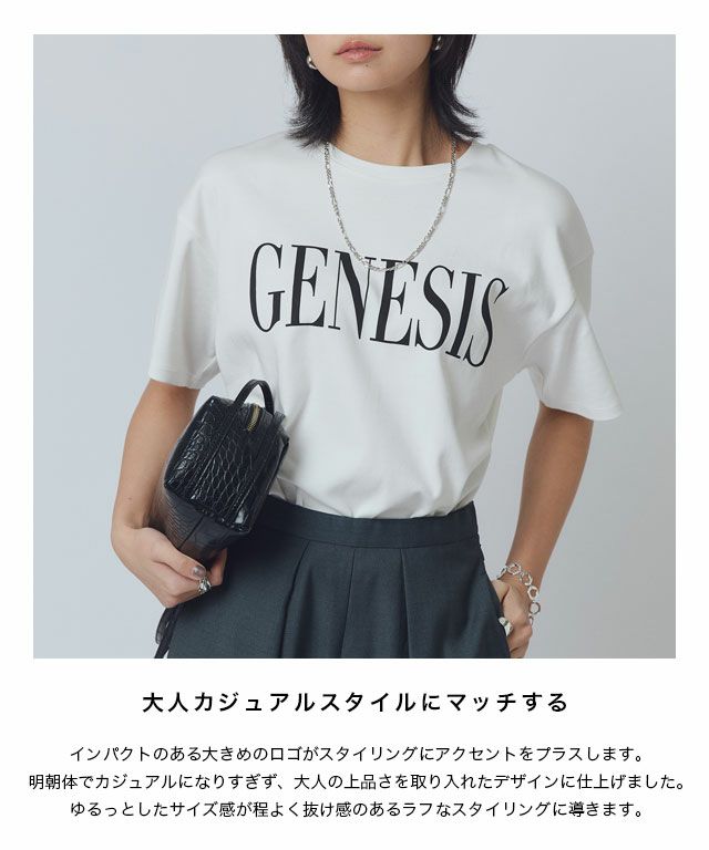 インパクトのある大きめのロゴがスタイリングにアクセントをプラスします。明朝体でカジュアルになりすぎず、大人の上品さを取り入れたデザインに仕上げました。ゆるっとしたサイズ感が程よく抜け感のあるラフなスタイリングに導きます。