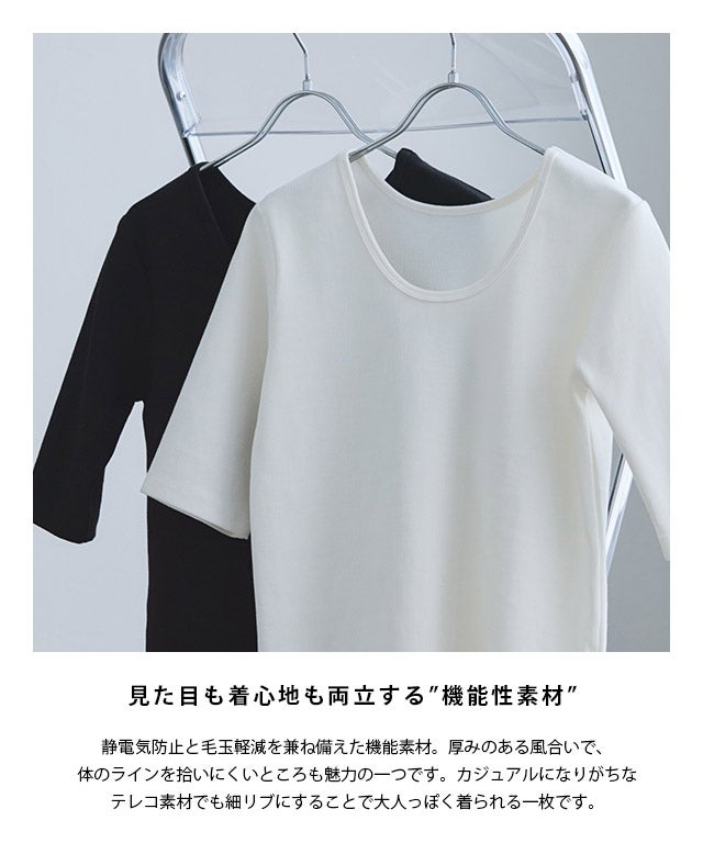 静電気防止と毛玉軽減を兼ね備えた機能素材。厚みのある風合いで、体のラインを拾いにくいところも魅力の一つです。カジュアルになりがちなテレコ素材でも細リブにすることで大人っぽく着られる一枚です。