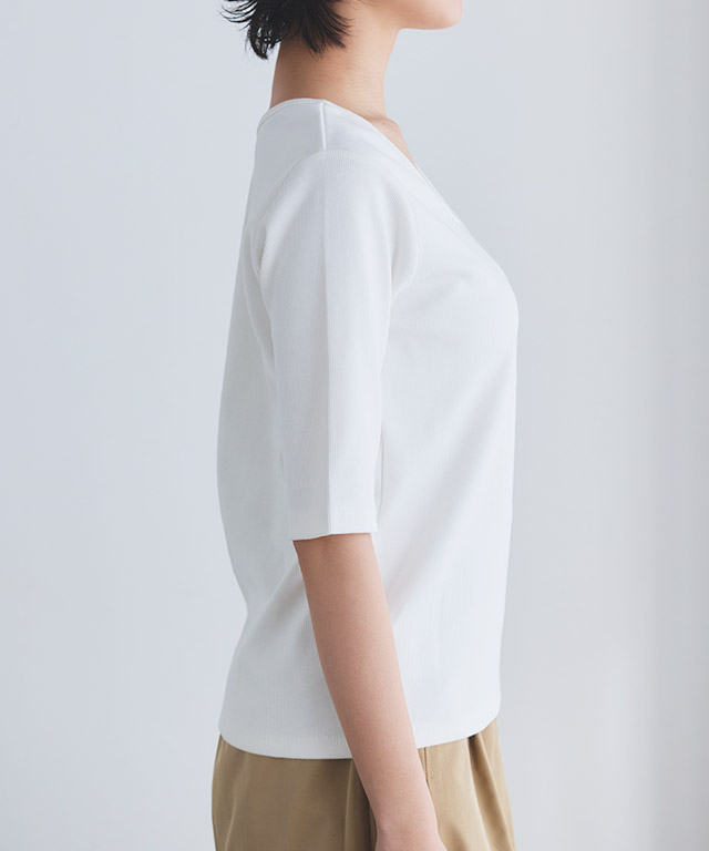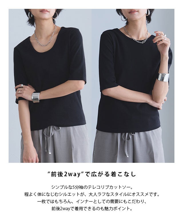 シンプルな5分袖のテレコリブカットソー。程よく体になじむシルエットが、大人ラフなスタイルにオススメです。一枚ではもちろん、インナーとしての需要にもこだわり、前後2wayで着用できるのも魅力ポイント。