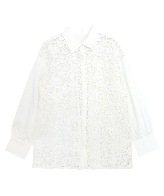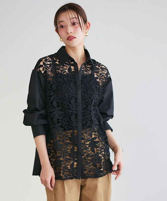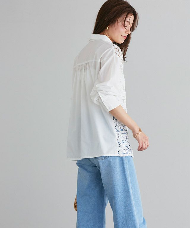 華やかな大ぶりのケミカルレースが魅力。袖と後ろ身頃は綿混素材でさらっとした着心地です。