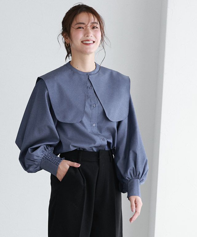 襟が別付けデザインのデニムブラウス。セットでの着用はもちろん、クルーネックブラウスとしても着回せる一枚。たっぷりとボリュームを持たせた袖が、女性らしいアクセントになるデザインです。甘めのディテールなので、デニムONデニムやパンツで外したスタイルがおすすめです。