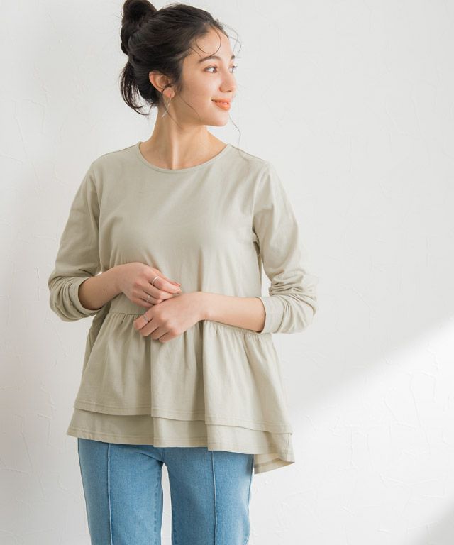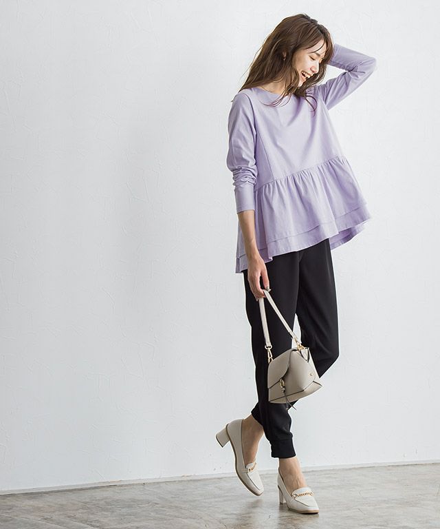 I 着丈はお尻が隠れる丈感です。袖丈は手の甲が隠れます。全体的にゆとりのあるサイズ感で、フリルの切り替えがウエスト周りをカバーしてくれます。