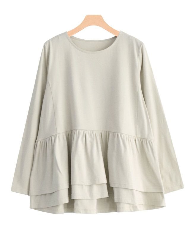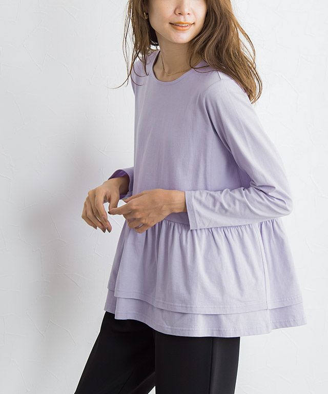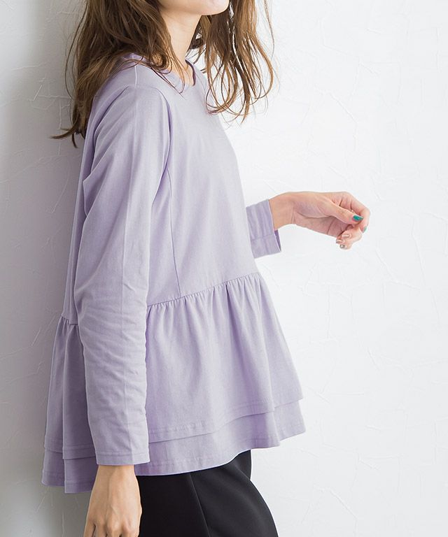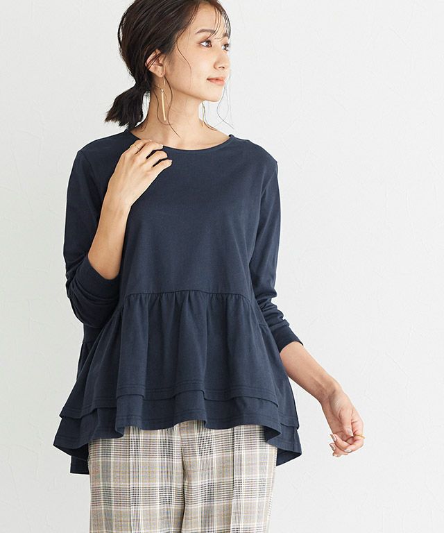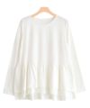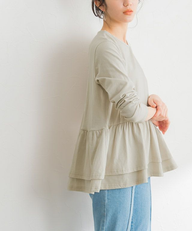 ウエストから広がるフリルデザインがフェミニンな印象の一枚。腰回りの体型カバーにもなる優秀デザインです。シンプルにパンツやスカートと合わせてもサマ見えするアイテムです。