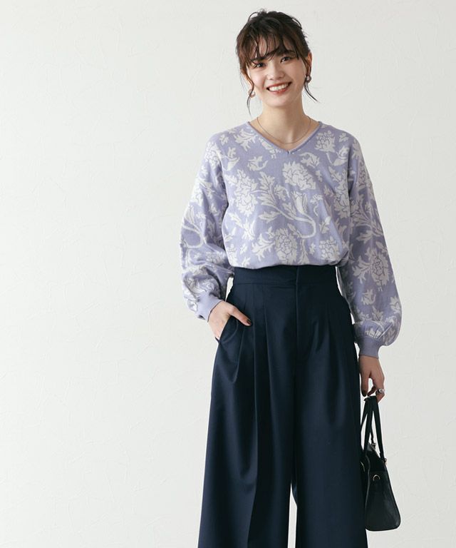 一枚でしっかりと着映えるボタニカルフラワー柄を、ジャカード織で編み立てました。贅沢なボリュームスリーブが柄と相まって、レトロ感がプラスされた女性らしさを演出。