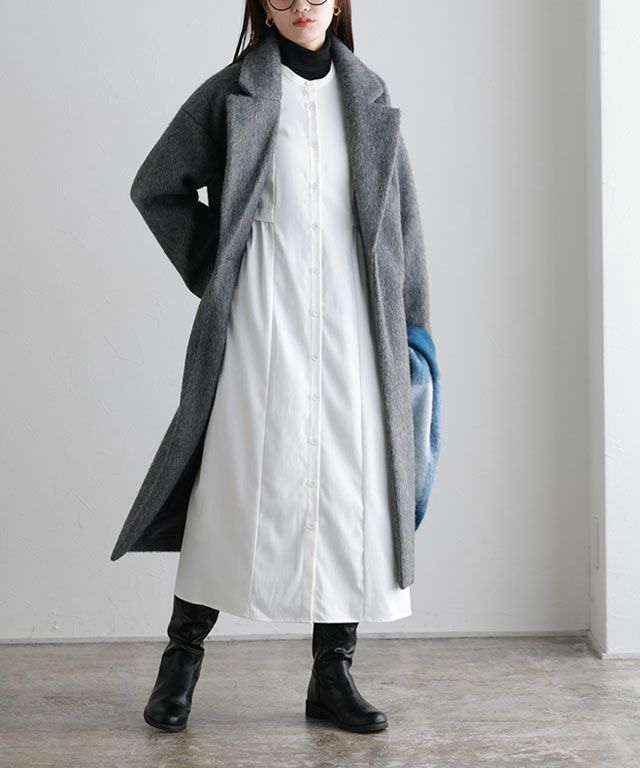 ワンピースは程よく厚みのあるシャツ素材で、通年使えるのも魅力。カーディガンはふんわりと軽い仕上がりのニット素材です。