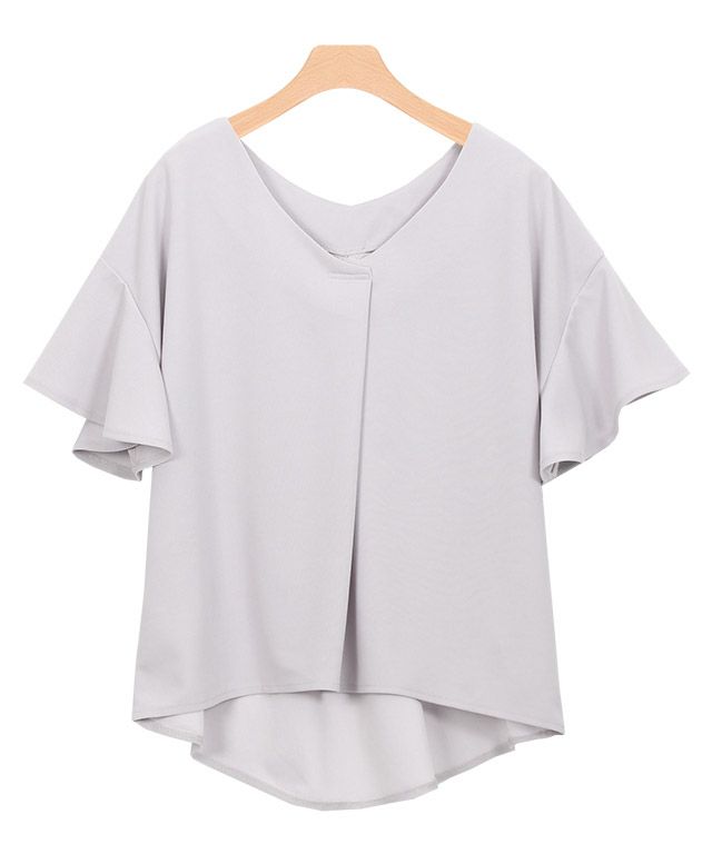 前後Vネック仕様にすることでナチュラルな抜け感をプラス。フレアスリーブデザインは腕周りを華奢に見せてくれ、フロント部分にタックを施すことで、自然なゆとりがうまれふんわりとしたシルエットに。
