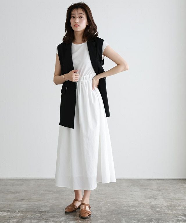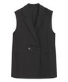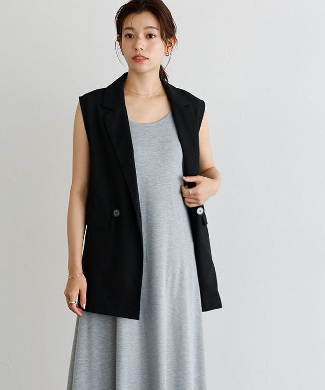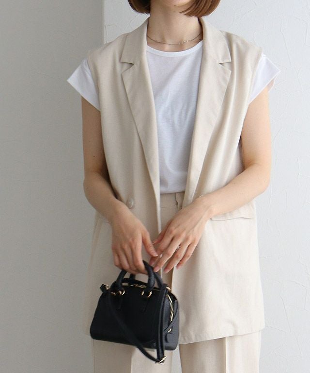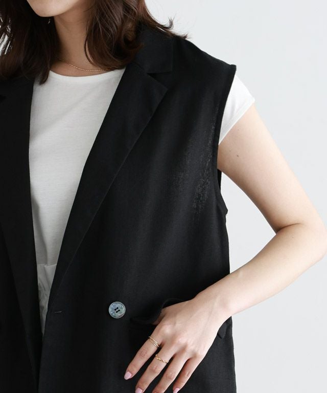ダブル仕様と襟付きデザインできちんと感がありつつ、リネン素材でカジュアルダウンしたジレ。ボリュームのあるインナーも合わせやすい、程良くゆとりのあるサイジングに仕上げました。ブラウスからTシャツまで幅広いインナーと合わせて着回せるアイテムです。同素材のパンツとの着用もおすすめです。