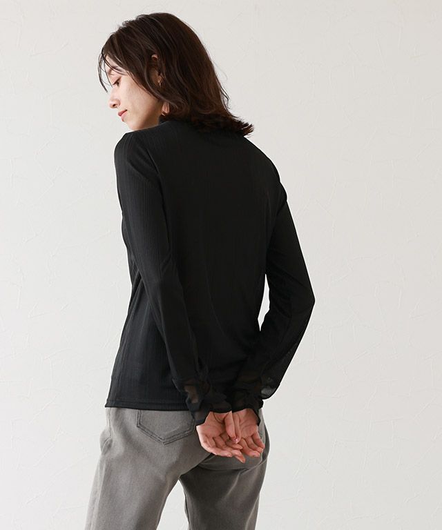 袖口には異素材感を持たせるシフォン素材。身頃は素肌がほんのり透ける、シアーな透明感が印象的なハイネックトップス。ストレッチの効いたリブ素材がサラッと肌になじみ、フィット感のあるシルエットに。